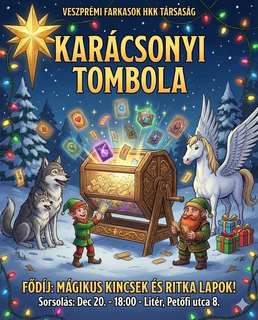 - Karácsonyi tombola 200 Ft/db ( Sorsolással nyerhető “mágikus kincsek”: ritka lapok, ZÉN Karácsony 2025 kiegészítők, Álomháború boosterek, egyedi póló, egyéb játékkiegészítők, csoki, pezsgő)