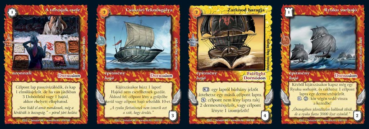 - 3 Cikázó fregatt: ingyenes (1 nekron) hajó, kör végén visszaadja a lapot és ott marad zanszilánkként, ha hajó pakli ellen játszunk, akkor ott is besegít: passzivizál és elmúlásjelzőt oszt