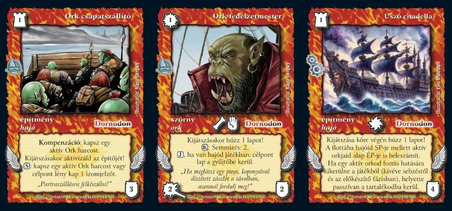 Fent már elspoilereztem, de az a szekció egyértelműen Dornodoné. A 3 Ork fedélzetmester - 3 Ork csapatszállító az alapja az egész paklinak. Előbbi cantrip, utóbbi aktivizálja az építőt, hogy az felhúzhasson egy újabb épületet illetve ad egy aktív (!) ork harcost. Ha mellé rakjuk a 3 Úszó citadellát, villám gyorsan össze tudjuk hozni a győzelemhez szükséges flotta méretet. A citadella védi is orkjainkat a leszedésektől, a fedélzetmester pedig side képességből tud semmizni is vagy J-re leszed (ha van hajónk, remélhetőleg lesz), alap lapok ide.